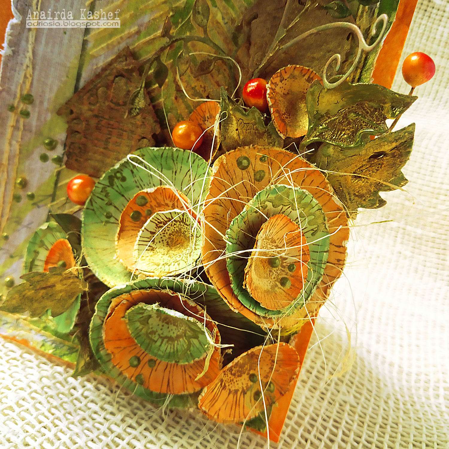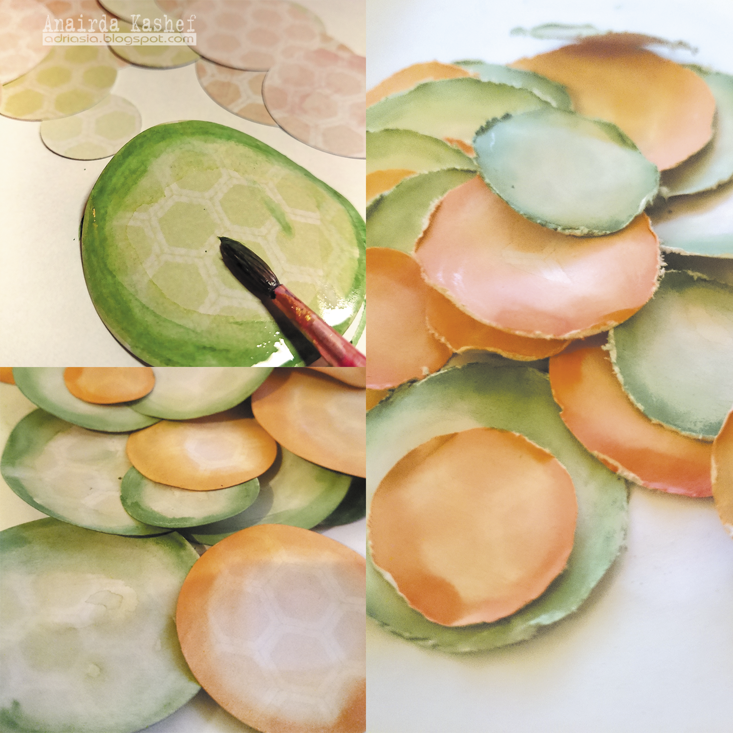 Режем круги и тонируем их зелёной и оранжевой краской. Когда краска высохнет состариваем края (я использую ножницы но есть специальные инструменты)