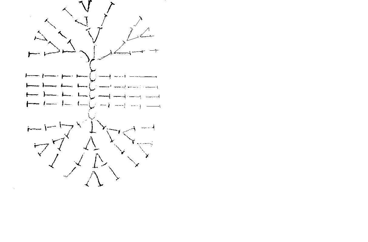 2-й ряд: 3 ст. б/н, во 2-ю от крючка петлю, затем 4 ст.б/н в каждую в.п., 3 ст. б/нзатем 4 ст.б/н в каждую в.п. Далее по схеме.