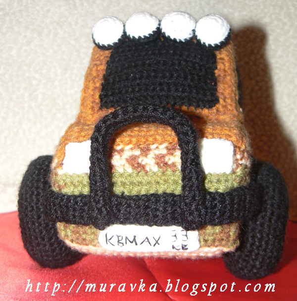 Я использовала пряжу YarnArt (35% шерсть, 65% акрил, 260 м/100 г) секционного крашения. Это благодаря ей джип слегка смахивает на такси:)) Первую деталь вязала как ляжет цвет, дальше пришлось подбирать, часто обрывая нить и присоединяя с нужного места. Однотонной будет немного полегче.