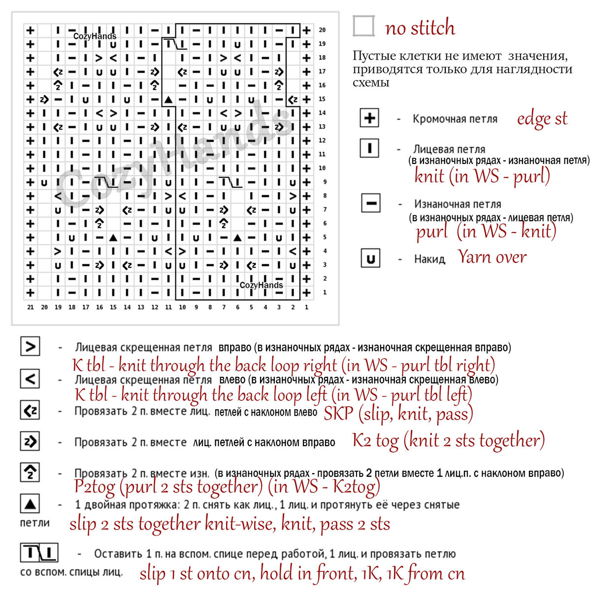 19 ряд: кром.п., 1 лиц.п., * 1 изн.п., 2 лиц.п., 1 накид, 2 лиц.п., 1 изн.п., 2 петли перекрестить влево и провязать их лицевыми,* 1 изн.п., 2 лиц.п., 1 накид, 2 лиц.п., 1 изн.п., 1 лиц.п., кром.п.