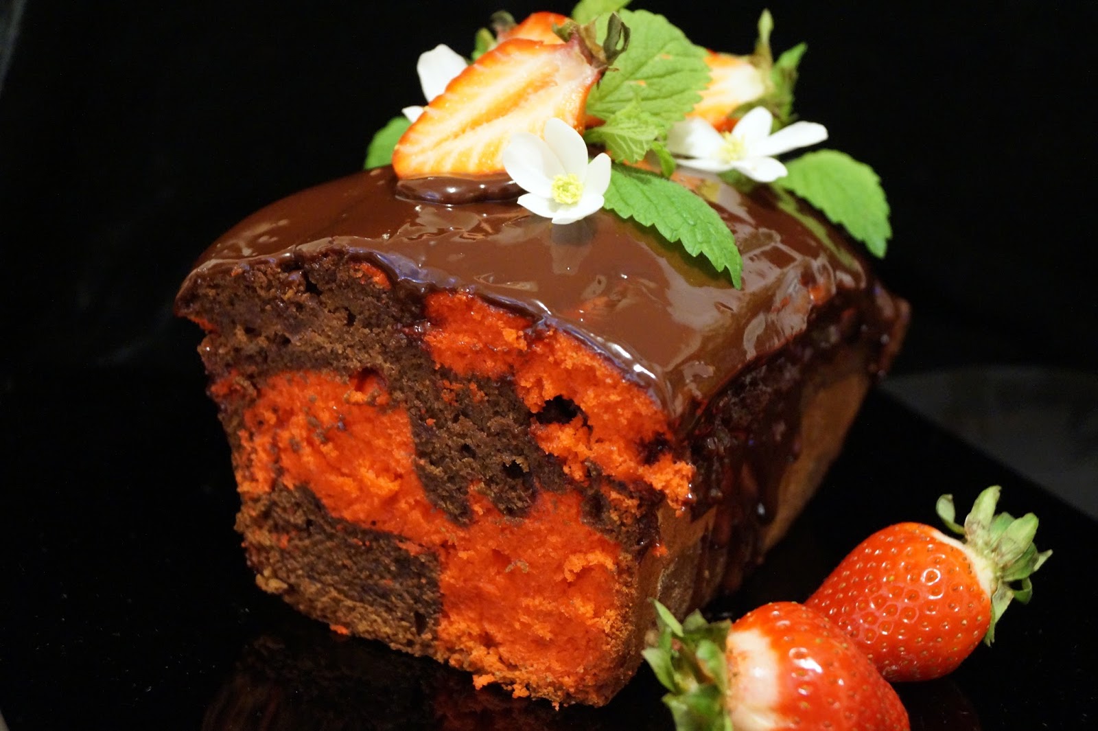Размягченное сливочное масло взбиваем, постепенно добавляя сахар с ванильным сахаром. Затем, по одному добавляем яйца, коньяк, сметану и просеянную муку, смешанную с разрыхлителем. Делим тесто на две части, в одну добавляем какао, а в другую- красный пищевой краситель, до нужного нам цвета. А теперь в смазанную форму выкладываем тесто в шахматном порядке. После того как все тесто выложили, необходимо постучать формой об стол...для того чтобы тесто улеглось.