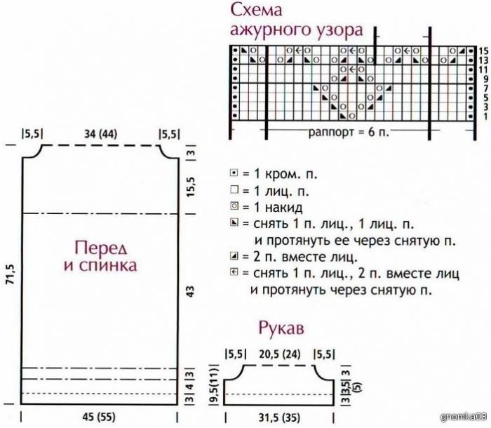Спинка. Набрать 81 (99) п., связать резинкой 1х1 3 см, затем 4 см лицевой гладью и продолжить вязание ажурным узором: первые 5 п. схемы, 4(5) раз повторить раппорт из 18 п., закончить ряд последними 4 п. схемы.