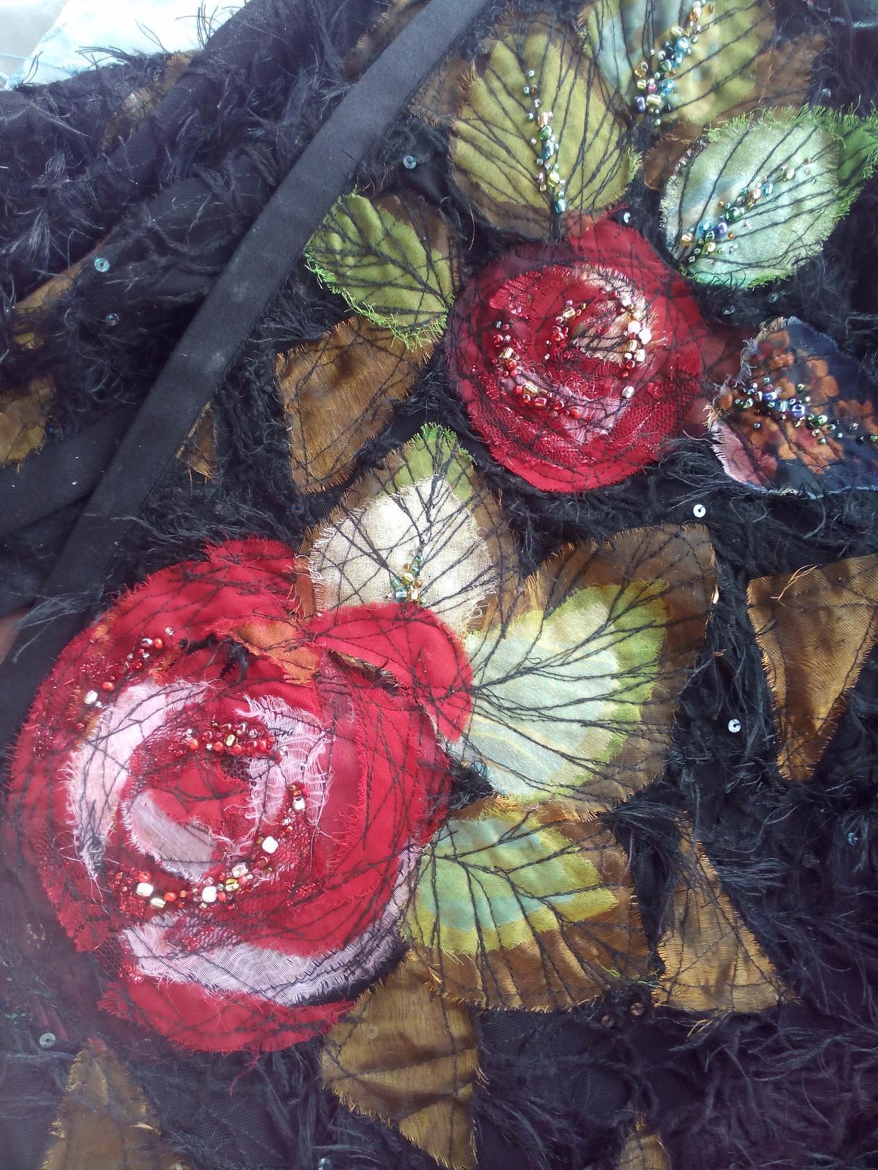 Розу по кругу, захватывая все лепестки и нити. Там где "травка", можно редким шагом строчкой "зигзаг".