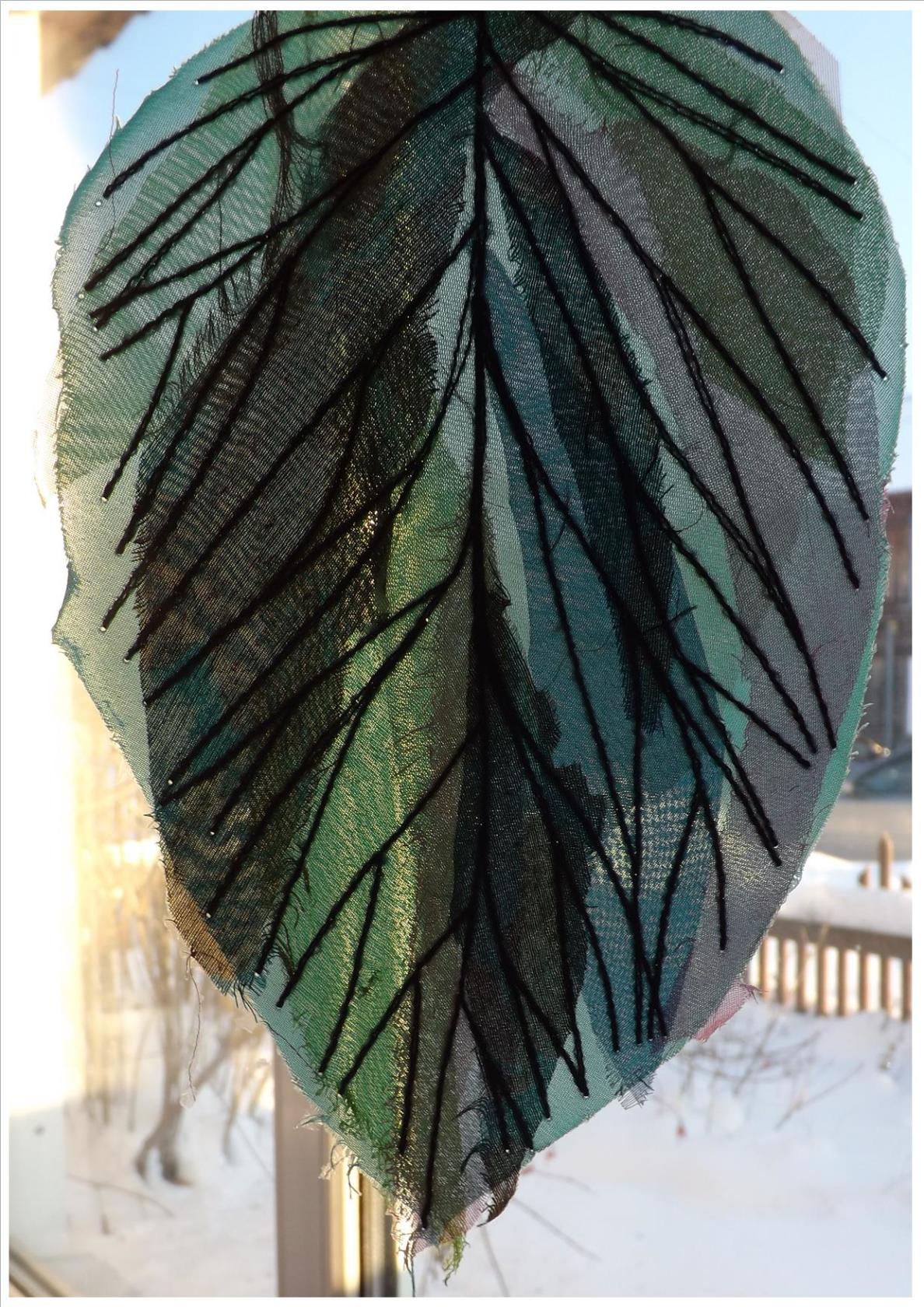 Листья по движению прожилок. Можно четче обозначить некоторые прожилки пристрочив "травку".