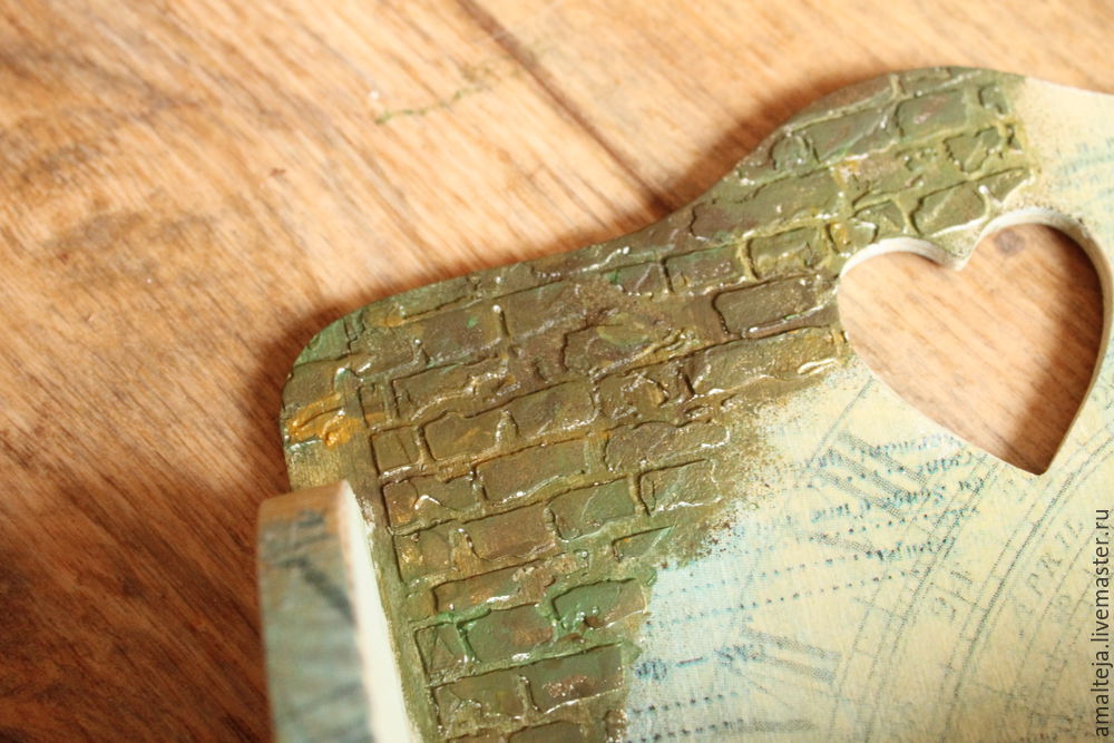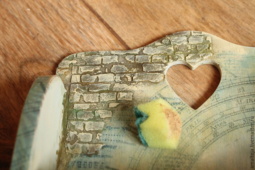 И дальше — надо делать из этого осень. Беру трафарет, кирпичики, у меня они такие «художественные», неровные, структурная паста немецкая Рельеф, мастихин и наношу пасту через трафарет, причем не очень стараясь, чтобы был аккуратный рисунок.