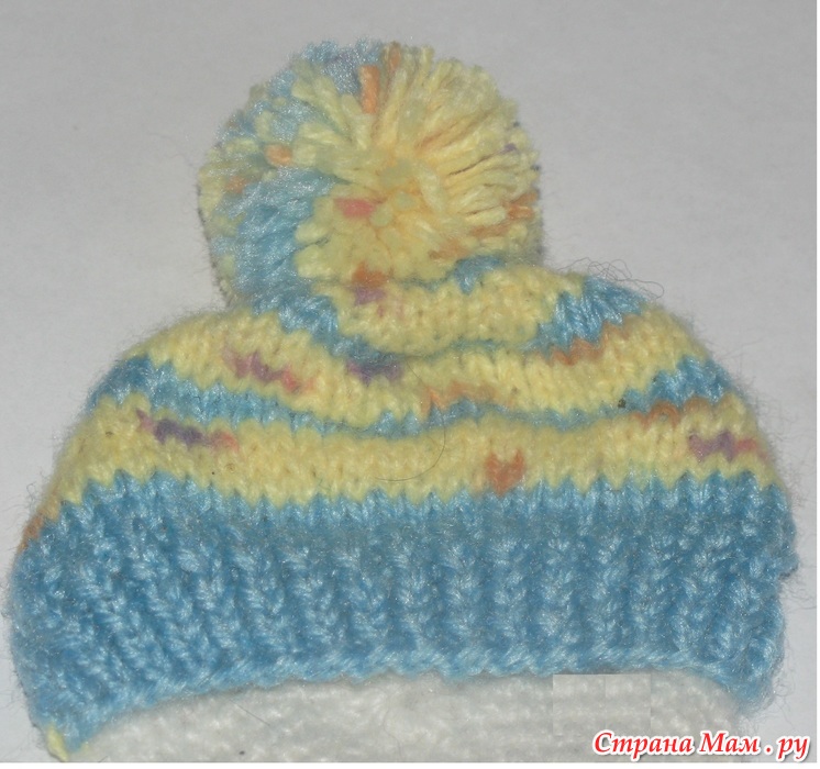 Вяжем шапку: набираем 38 петель и вяжем платочной вязкой 32 ряда и закрываем петли. Выполняем шов, макушку стягиваем, делаем белый помпон и пришиваем.