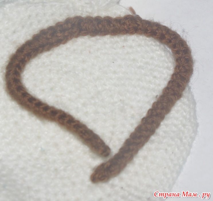 Сначала вяжем голову: белой нитью на спицы набираем 20 петель и вяжем лицевой гладью, прибавляя в 3 и 5 рядах по 10 петель. Связав 22 ряд, набить получившуюся деталь синтепоном. Затем в 23, 25 и 27 ряду прибавить снова по 10 петель (итого в ряду будет 70 петель). На 120 ряду закрыть петли. Выполнить шов, завернуть края вовнутрь, подшить на уровне шеи и слегка стянуть.