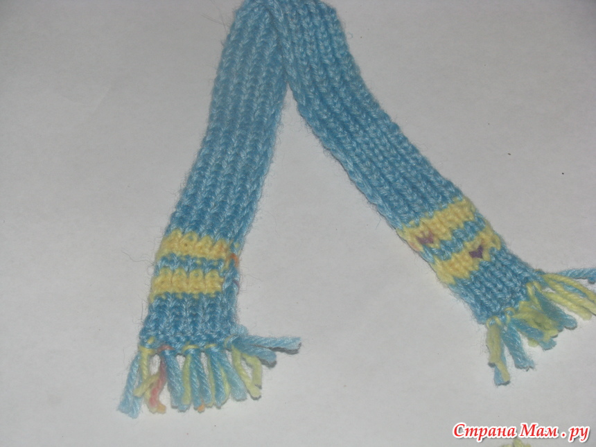 Вяжем шарф: голубыми нитками набираем 8 петель и вяжем около 100 рядов.