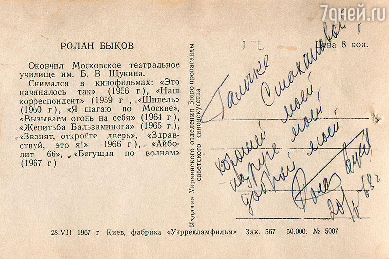 С тех самых неудачных съемок в «Гори...» привез нам гостинец — мешок яблок. Вывалился с ним из такси, мешок чуть не с него ростом. Он маленький был, ниже меня на полголовы. И все рассказывал маме, как любит ее дочь. До сих пор храню его фото с надписью «Галочке Стахановой, хорошей моей, подруге моей, доброй моей». Много других отдала Лене Санаевой, когда она меня приглашала на вечер памяти Быкова, за что очень благодарна. Еще осталось несколько фото со съемок, на которые Ролан брал меня с собой: с «Сюжета для небольшого рассказа», с площадки фильма «Внимание, черепаха!», который Быков снимал уже в качестве режиссера. Даже в Сочи на съемки тогда вместе съездили. Я у него числилась ассистентом по реквизиту.