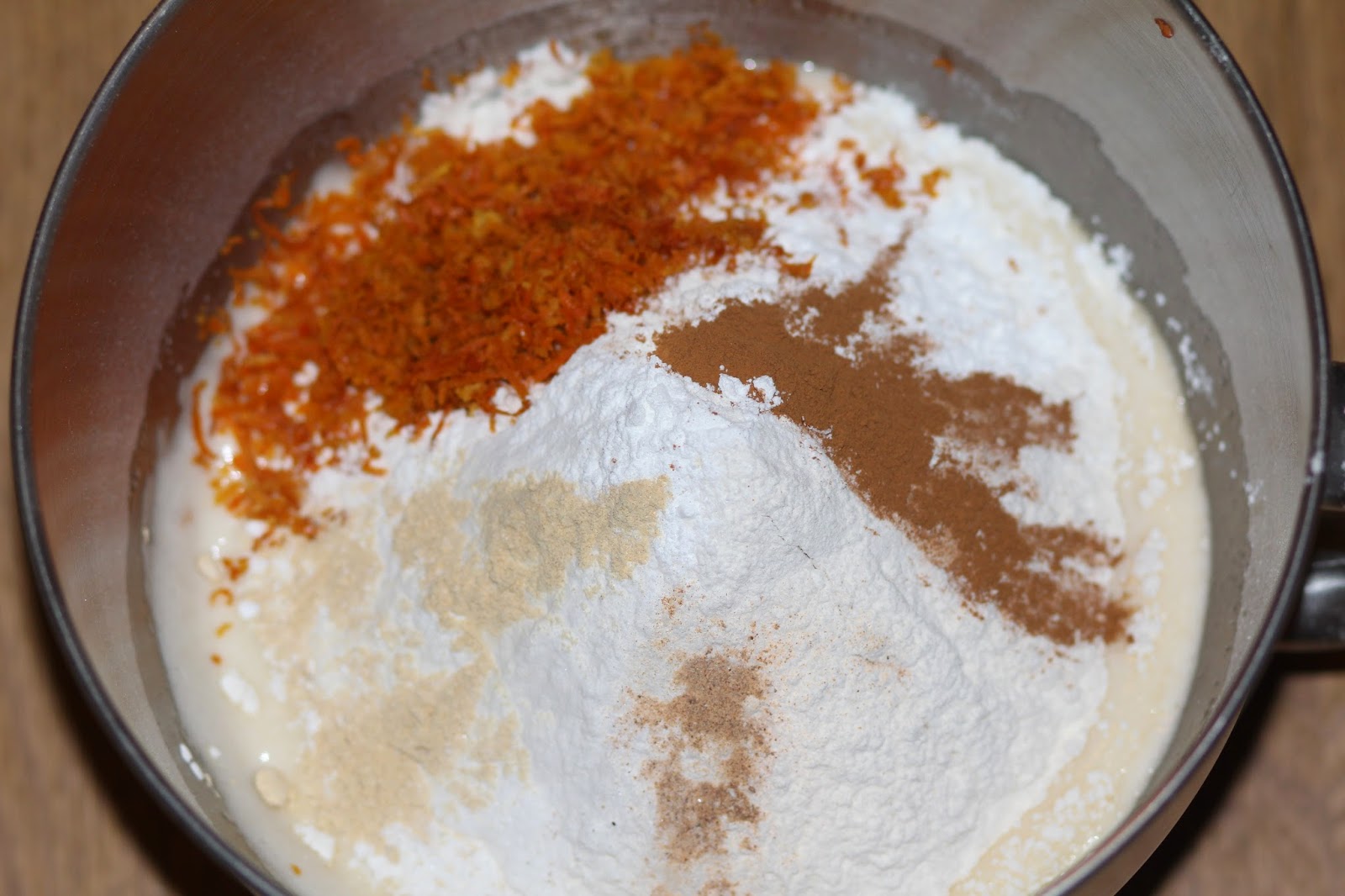 4. Добавить просеянную муку, соль, разрыхлитель, корицу, имбирь, ванилин, кардамон, мускатный орех и цедру апельсина.