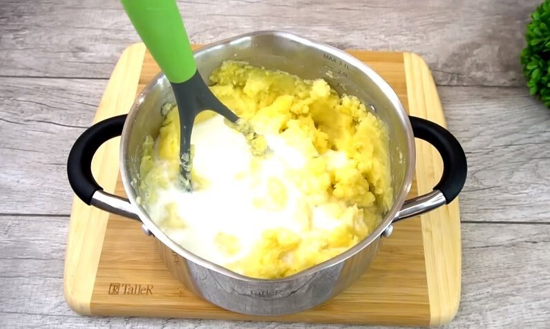 Картофель отварился, сливаем картофельный отвар, добавляем сливочное масло и превращаем в картофельное пюре. Наша цель, чтобы получилось вкусное картофельное пюре. По желанию можно разбить яйцо, я сегодня добавила только молоко.