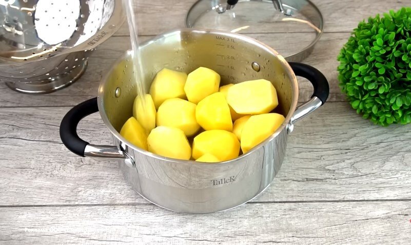 Для начала поставим варить картофель, очистим картофель, вес очищенного картофеля 700 грамм, добавим соль, заливаем кипятком и ставим вариться до готовности, готовность проверяем ножом.