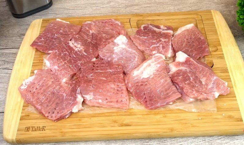 Пока картофель отваривается все подготовим. Мясо 800 грамм порежем на порционные кусочки, у меня сегодня свиной окорок. Мясо отбиваем с двух сторон тыльной стороной ножа, или специальным молотком.