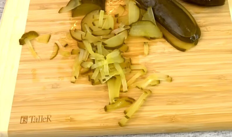 Огурцы маринованные 200 грамм порежем соломкой, по желанию и вкусу можно взять соленые огурцы. Я использую консервированные с лимонной кислотой, домашнего приготовления.