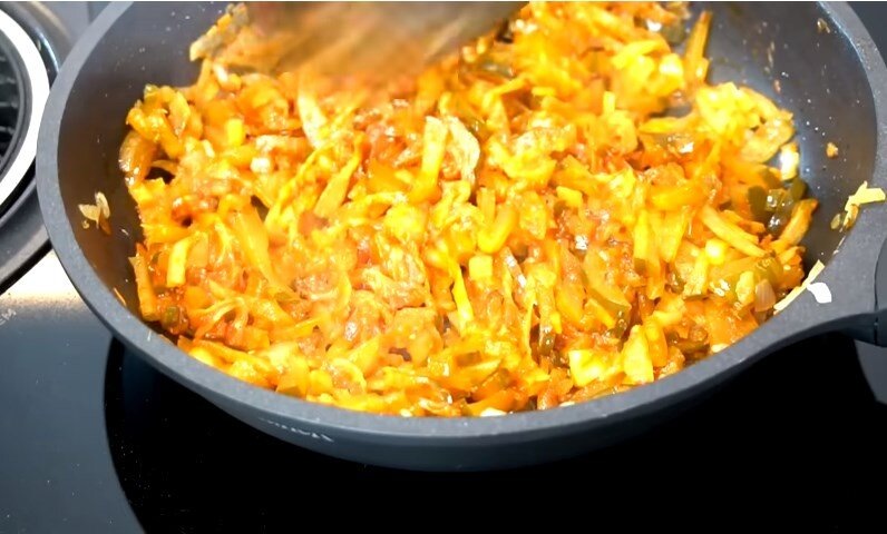 Луковицу весом 100 грамм порежем кубиками. На сковороду наливаем растительное мало, кладем лук и жарим его до полупрозрачности ,теперь добавляем огурцы и жарим все вместе минуты 3-4, добавляем 1 ст.л. томатной пасты, перемешиваем и варим еще 1-2 минуты, снимаем с огня.