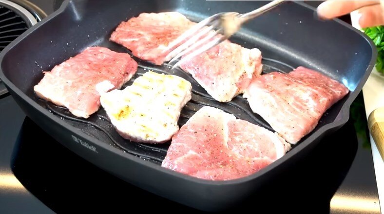 Подготовленное мясо нужно обжарить на большом огне, чтобы в нем быстро запечатались соки. Мне удобнее делать это на сковороде гриль, так как она большая, и в ней у меня обжаривается практически все мясо за один раз.