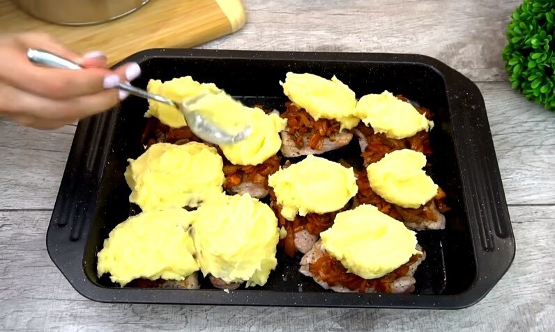 Берем противень, смазываем маслом, кладем обжаренное мясо на противень, на мясо кладем начинку, закрываем картофельным пюре.