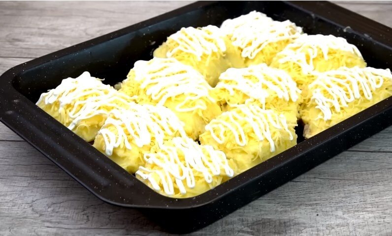 Сыр грамм 80 натрем на мелкой терке, посыпаем мясо. В мешочек кладем 2 ст.л. майонеза, срезаем краешек ножницами и поливаем сверху на сыр майонез.