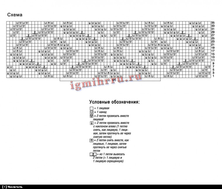 Ажурный узор: число петель кратно 32 + 1 + 2 кром. Вязать по схеме, на которой даны лицевые ряды. В изнаночных рядах все петли и накиды провязывать изнаночными. Начать с 1 кромочной и петель перед раппортом, раппорт постоянно повторять, закончить петлями после раппорта и 1 кромочной. Постоянно повторять 1–36-й ряды. При выполнении убавок следить за тем, чтобы число накидов и провязанных вместе петель внутри узора совпадало; при необходимости петли по краю провязывать лицевой гладью (= лицевые ряды – лицевые петли, изнаночные ряды – изнаночные петли).