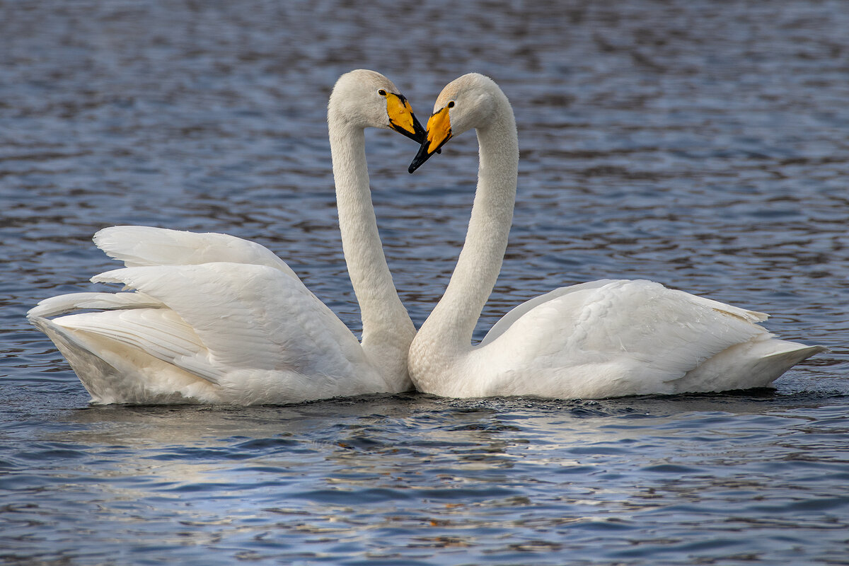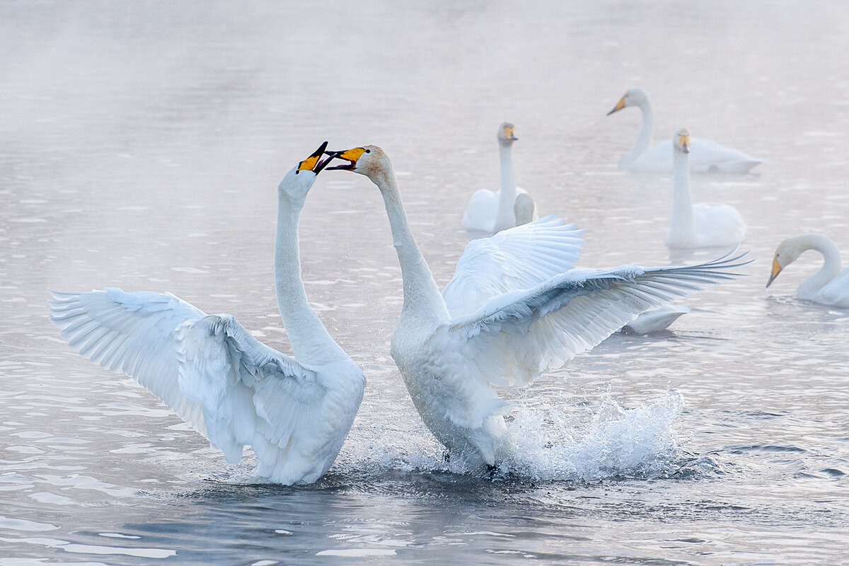 Танцующие лебеди на водной глади незамерзающего озера Алтайского края запечатлён в фотографиях.
