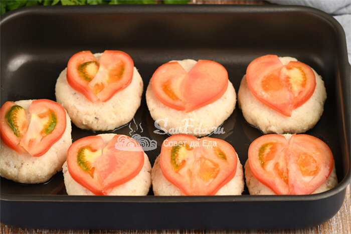 8. Формуем из рыбного фарша округлые плоские котлеты (7 шт.) и выкладываем в форму (можно предварительно смазать растительным маслом).