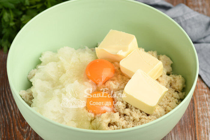 6. Разбиваем куриные яйца (у меня небольшого размера, можно заменить на одно большое яйцо) и добавляем размягченное сливочное масло. Фарш из пикши получается суховатый, поэтому обязательно добавляем масло.