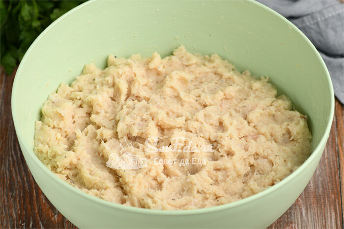 7. Солим, перчим и хорошо все перемешиваем. Если есть время, то фарш можно оставить в холодильнике на 1-2 часа. Фарш получается густой (выход около 850 г).