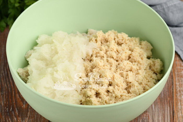 5. Хлеб замачиваем в молоке и отжимаем (выход около 130 г, его вес не должен быть выше 30% от веса филе рыбы, иначе котлеты получатся с хлебным вкусом). Лук измельчаем и добавляем в миску.
