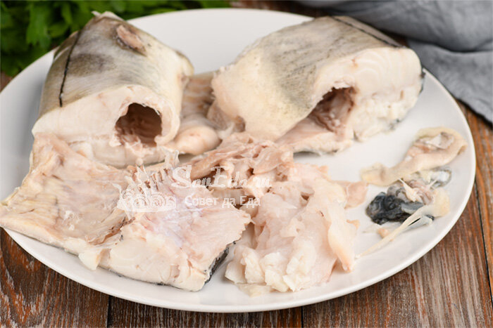 3. Затем вынимаем рыбу на тарелку, по большим костям разделяем и удаляем мелкие косточки. Процесс очень легкий. Рыба внутри сырая.