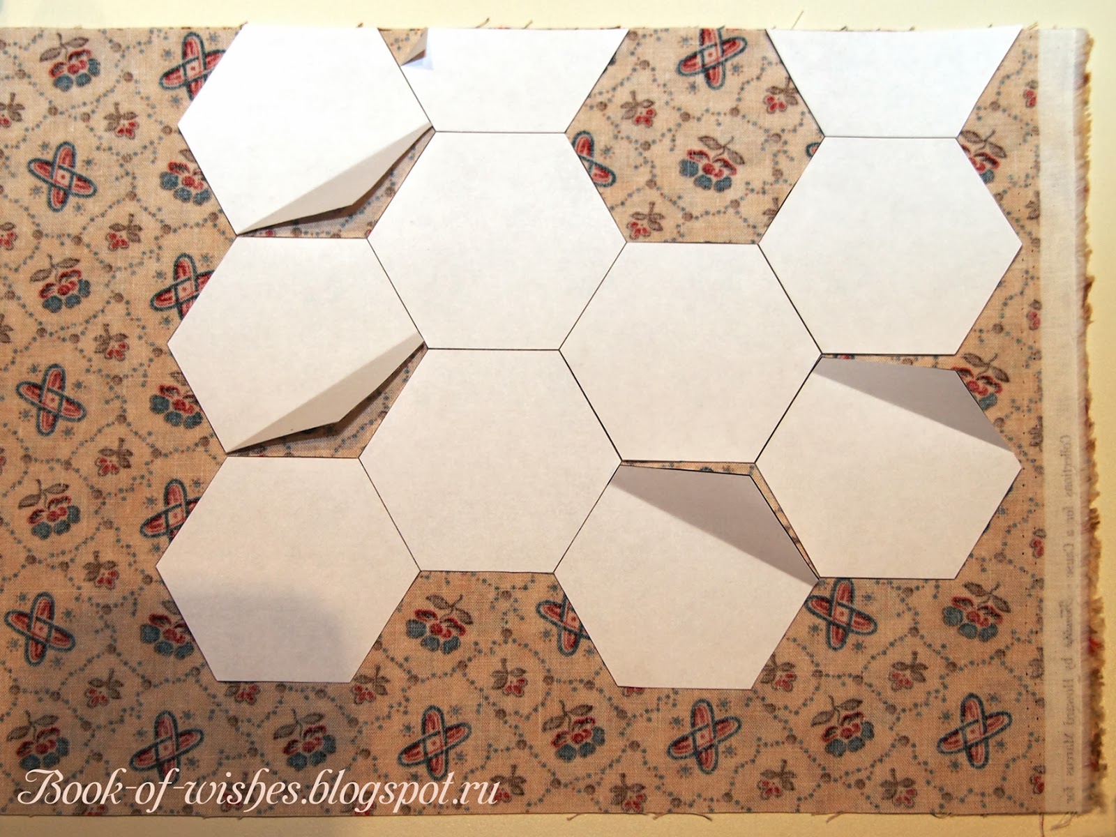 И дорисовать снизу ещё пару шестиугольников. Это "бонусные" детальки, т.к. все отрезы у меня оказались чуть больше четверти ярда, а именно 24-25 см. Казалось бы, всего 1,5 см - а какая выгода!