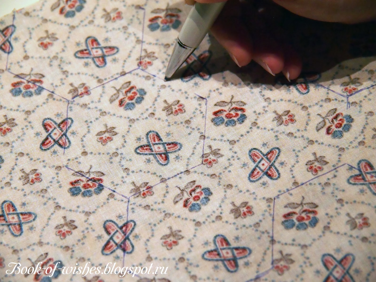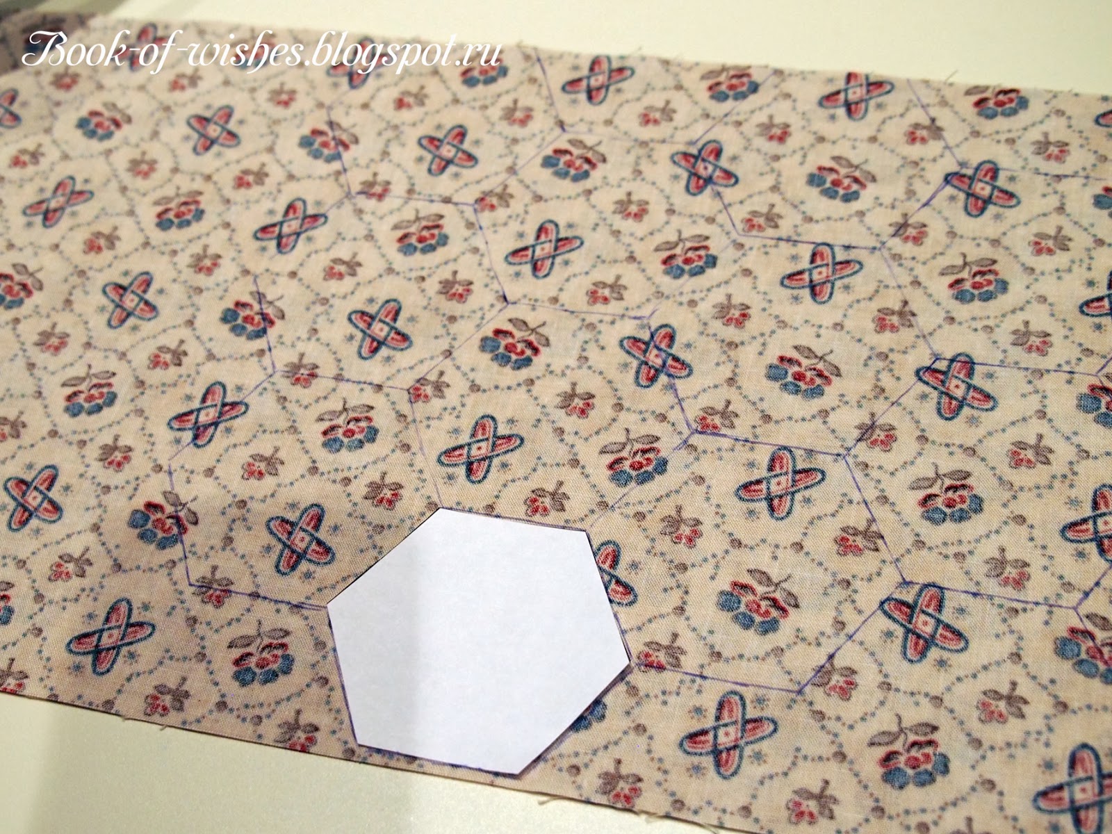 Ткань была сложена пополам, потому и кроить я решила сразу в два слоя. Сколов иголками первую ткань, я начала обводить большой шаблон (с прибавками на швы), старательно пририсовывая шестиугольник к шестиугольнику. Это было ужасно - долго и нервенно! В общем, в первый вечер я освоила только 3 отреза ткани, и мой пыл как-то потихоньку начал таять.
