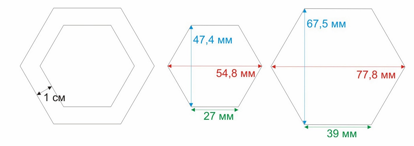 Сначала я выбрала оптимальный для себя размер шестиугольника. Нарисовав на листе несколько размеров и распечатав, я остановилась на фигуре со стороной 2,7 см. Затем сделала прибавку на шов по 1 см с каждой стороны, получила в итоге шестиугольник - шаблон для раскроя на ткани.