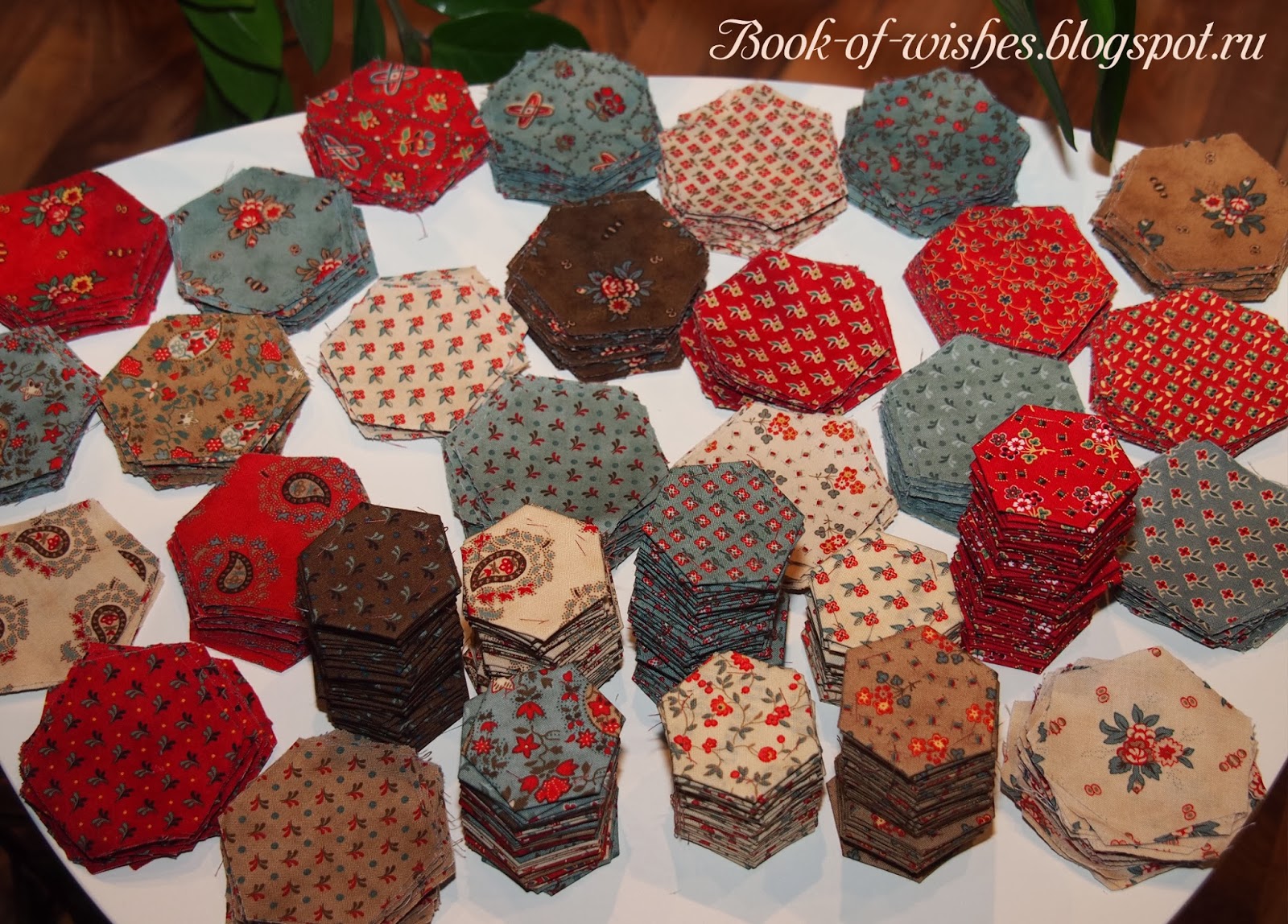 - 35 видов расцветки по 1/4 ярда на шестиугольники (32 как необходимость и еще 3 однотонные от жадности);