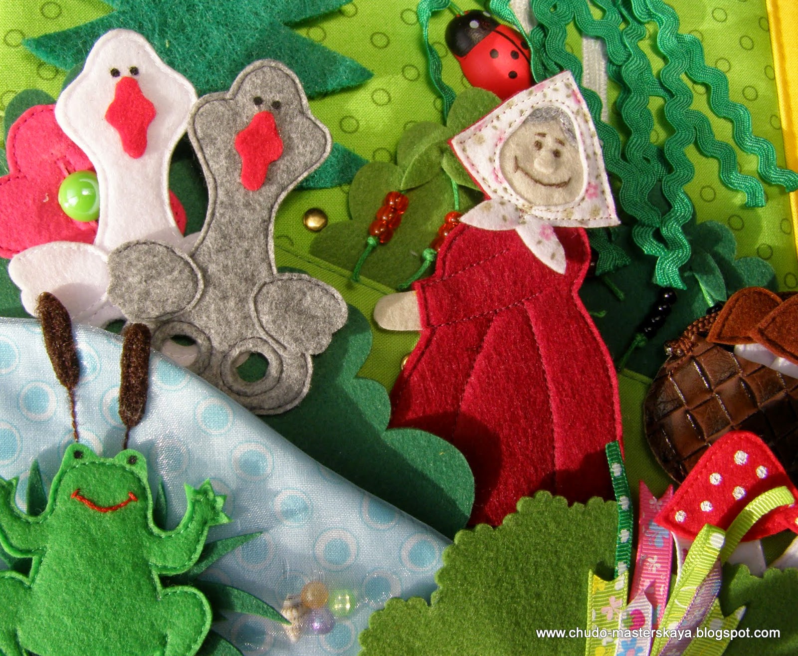 Мама Полиночки подчеркнула, что ей нравится использование разнофактурных материалов в развивающей книжке. Поэтому, где это было возможно, я старалась заменить фетр на другие материалы: ёлочка- жесткая губка, озеро - гладкая органза, кружевные цветочки у дома, рельефный кожзам, мешковина в домике Сороки, креп-сатин на деревьях разной стороной.