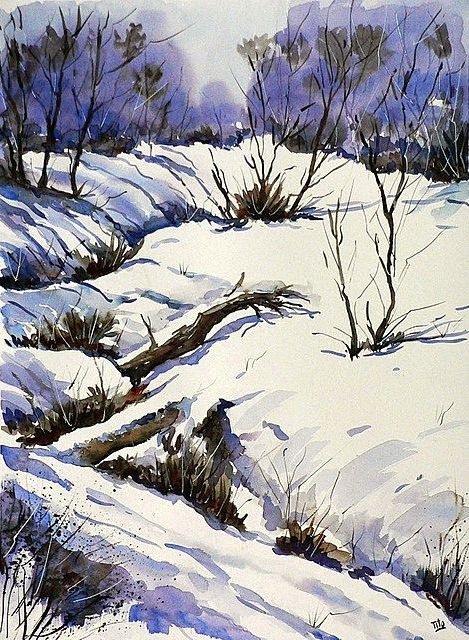 Каким может быть снег, если его рисуют акварелью? Интересно посмотреть, как изображают акварелью снег разные художники, какие цвета и приемы используют.