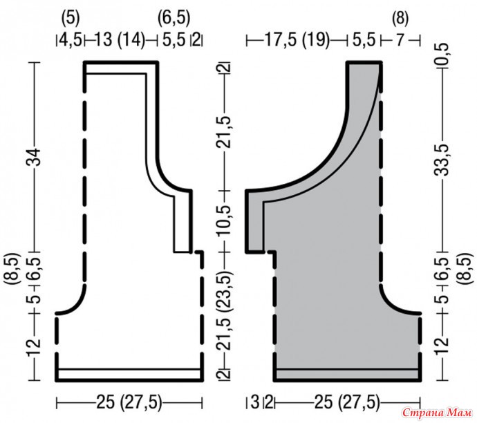 Через 10,5 см = 28 р. от разделения вязания закрыть для скосов с обеих сторон 1 х 5 п., затем в каждом 2-м р. закрыть 8 (11) х 2 п. и 10 (7) х 1 п., при этом постоянно вязать первые и последние 5 п. платочной вязкой, а между ними вязать лицевой гладью = 20 п.