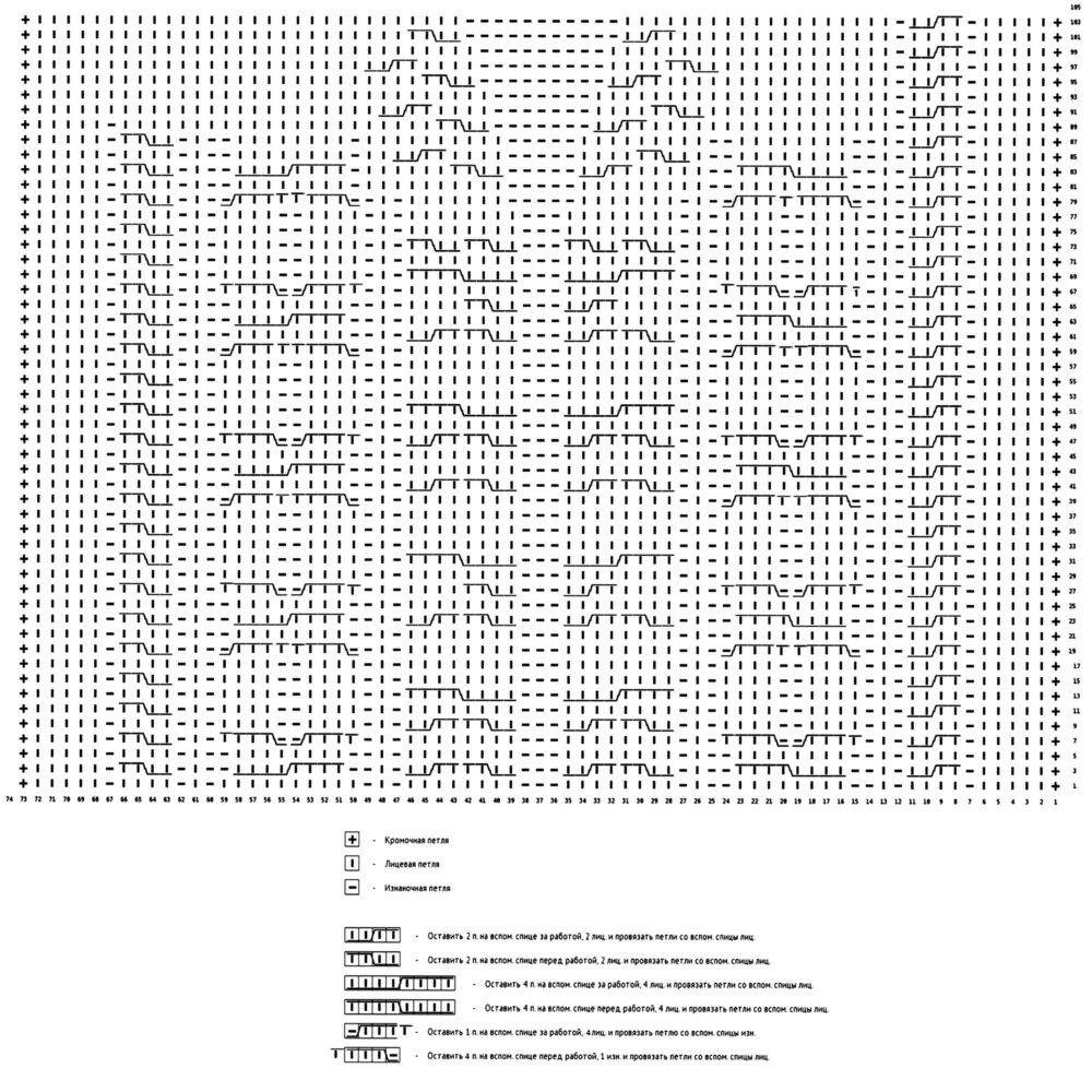 Основной узор для переда (на рукавах идут только жгуты и о них напишу ниже отдельно) — не бойтесь большой схемы, тут всё стандартно и просто.