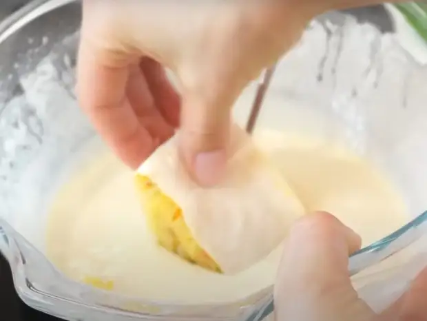 Обваливаем рулетики в кляре и кладем на сковороду с горячим растительным маслом.