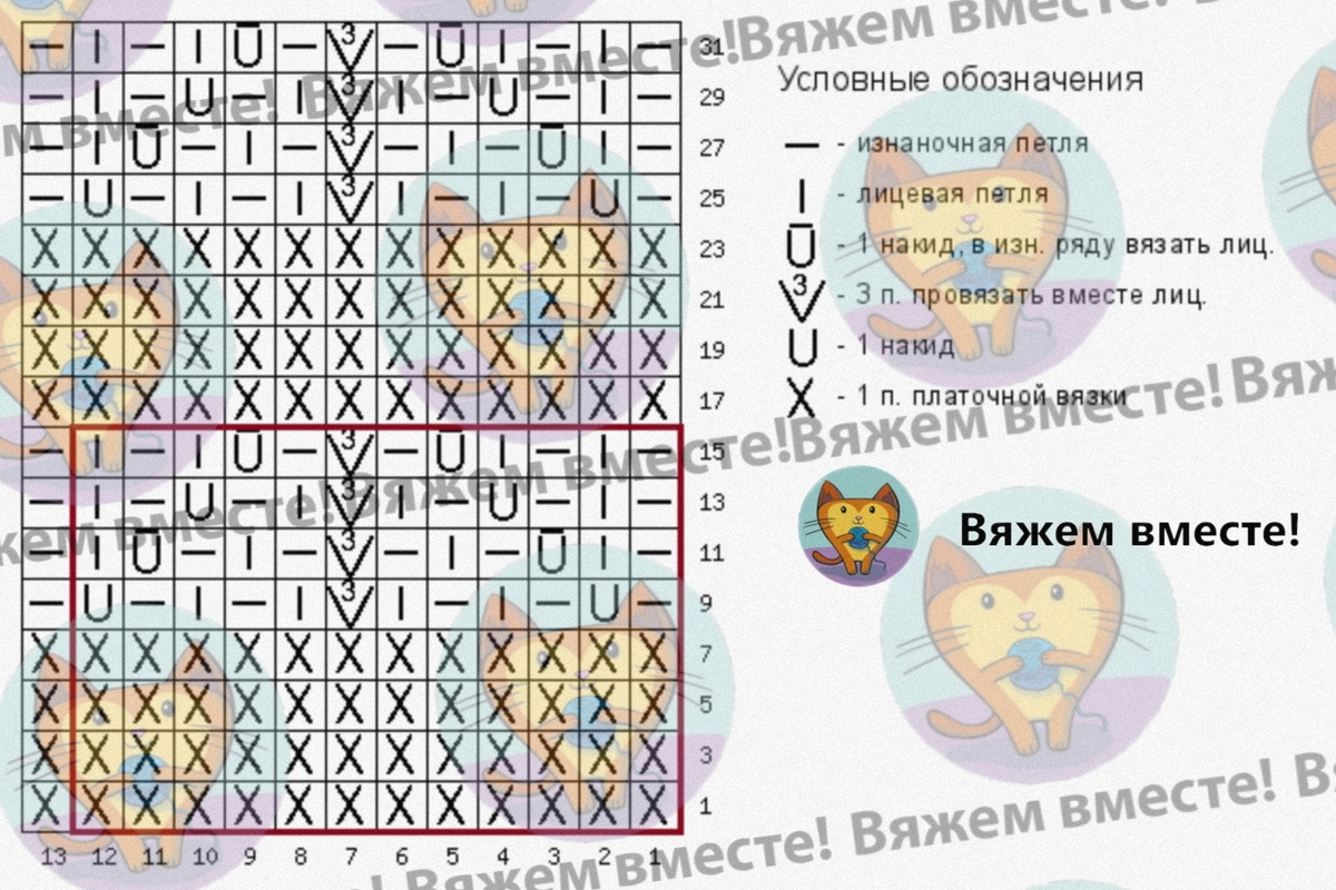 Раппорт узора равен 12 петлям по ширине полотна и 16 рядам по высоте, выделен красной рамкой.