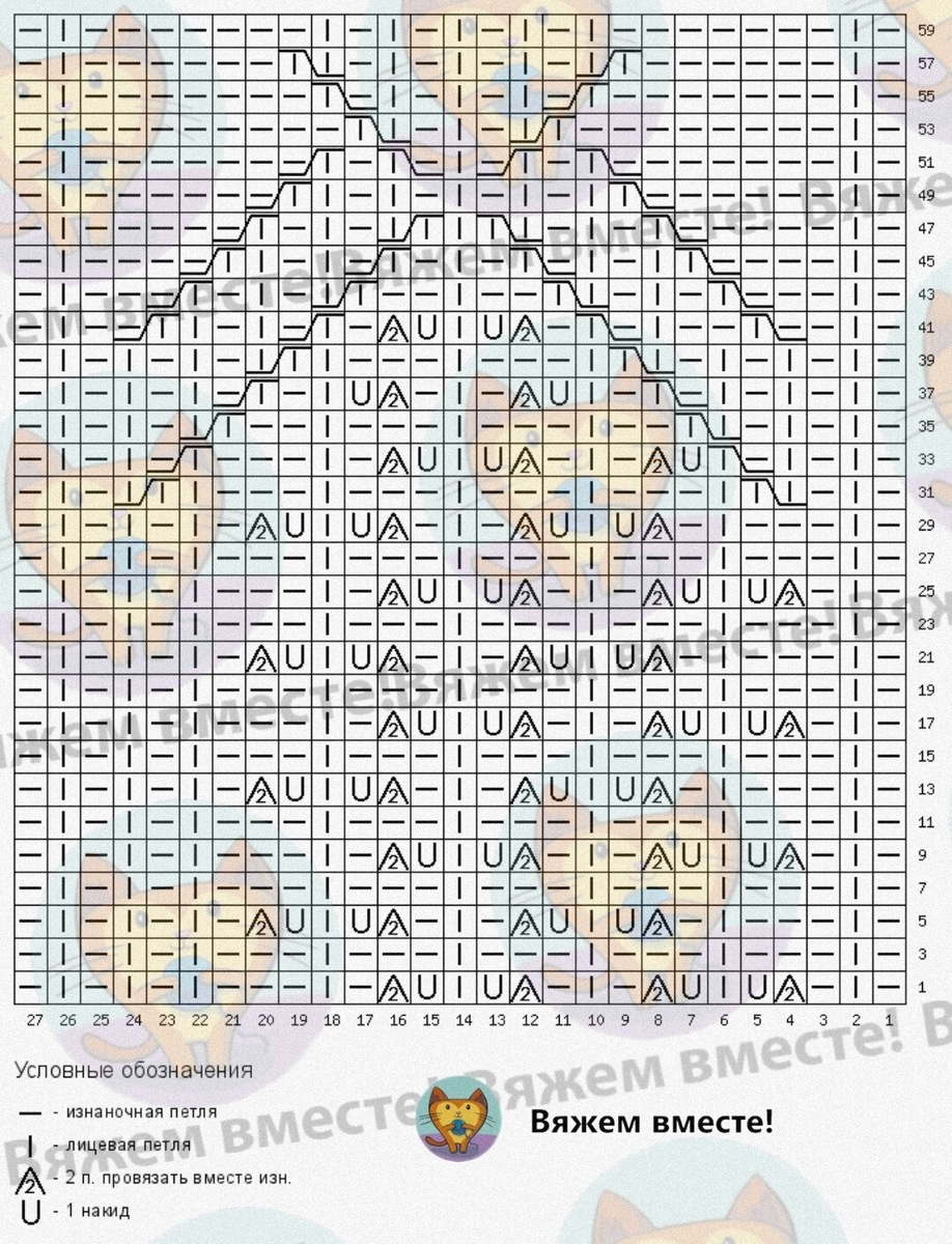 На схеме показан принцип вязания одного элемента, который включает четыре вертикальные дорожки с ажурными включениями.