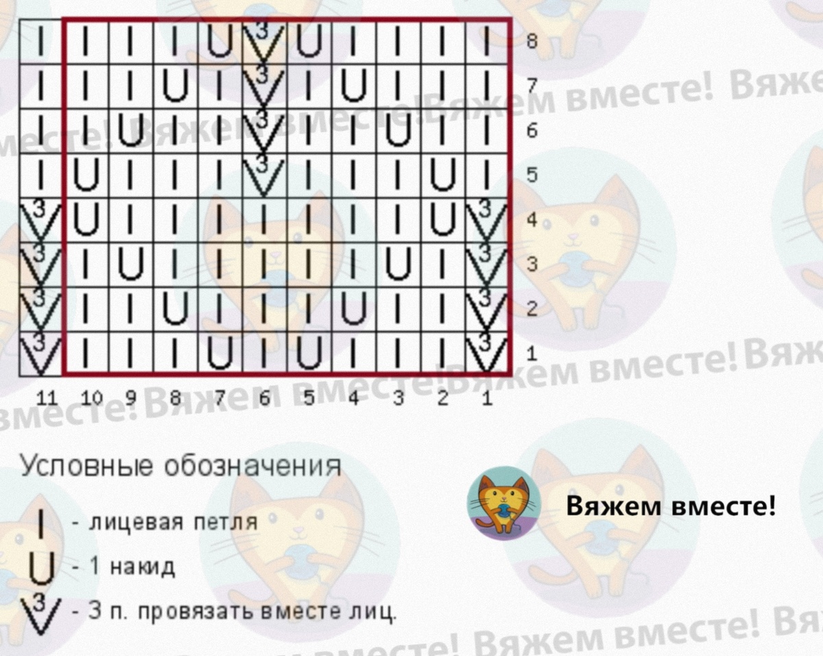 Ажурный узор совсем не сложный, единственный момент, который может смутить начинающую рукодельницу, — накиды и убавления выполняются в каждом ряду вязания, что может вызвать путаницу при вязании с поворотом полотна.