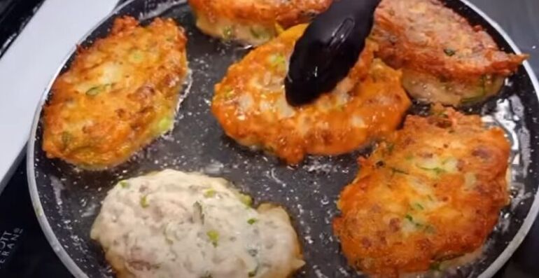Нарежьте зеленый лук и добавьте к фаршу. Смешайте продукты со сковороды с тестом. Ложкой набирайте смесь и выкладывайте на горячую сковороду. Обжаривайте с каждой стороны до румяного состояния.