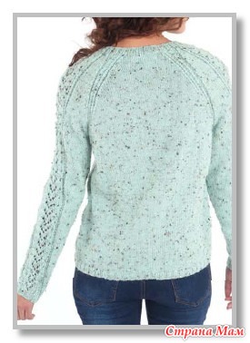 Рукава: набрать 44[48:48:48:47:49] п., и вязать как спинку до **, убавить 1 п.[убавить 3 п.: убавить 1 п.: убавить 1 п.:прибавить 2 п.:прибавить 2 п.] в последнем ряду = 43[45:47:47:49:51] п. Сменить спицы на № 4mm, и далее вязать лиц. гладью с ажурной дорожкой. Ряд 1 (лиц.): 11[12:13:13:14:15] лиц. п., 21 п. ажурной дорожки с 1-го ряда, 11[12:13:13:14:15] лиц. п. Ряд 2: 11[12:13:13:14:15] изн. п., 21 п. ажурной дорожки со 2-го ряда, изн. до конца. Далее вязать с центральной ажурной дорожкой и прибавлять петли в каждом 8-м[8-м:6-м:6-м:6-м:4-м] ряду = 53[65:57:73:71:69] п., затем в каждом 10-м [10-м:8-м:8-м:6-м:6-м] ряду = 69[73:79:83:89:95] п. Далее вязать прямо до общей высоты рукава = 44[44:44:44:45:45] см, закончить изн. рядом.
