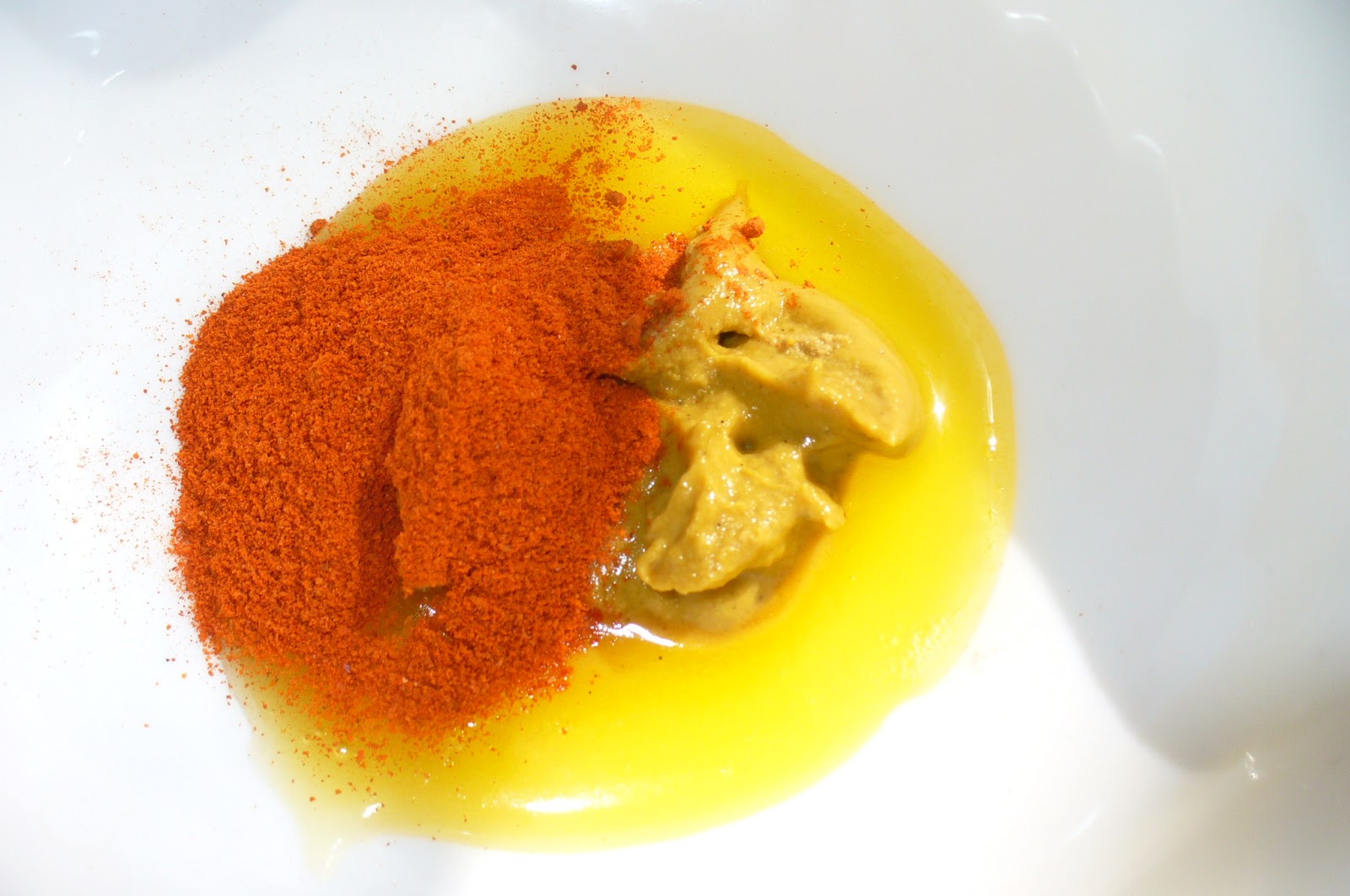 Затем приготовьте соус-маринад. Для этого в глубокой тарелке смешайте мед, горчицу, паприку, соль, перец.