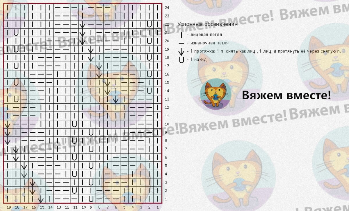 Раппорт узора равен 19 петлям по ширине полотна и 24 рядам по высоте, выделен красной рамкой на схеме.