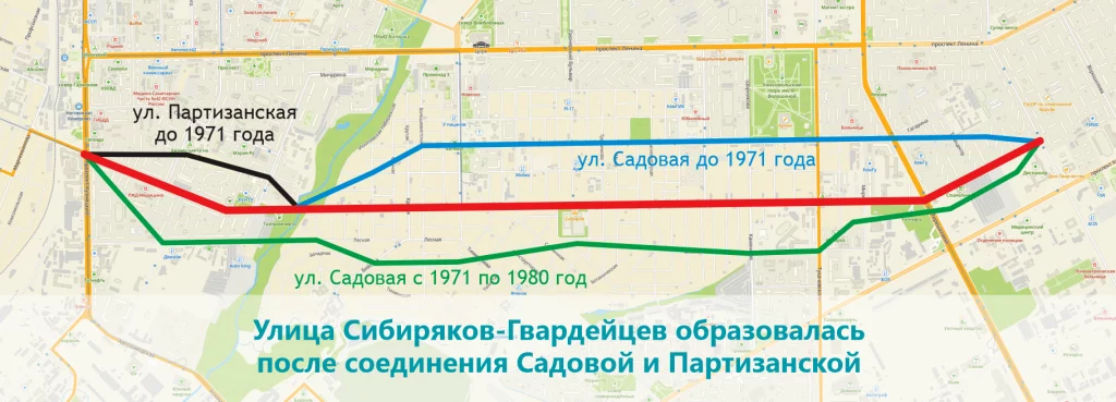 Часть нынешней Сибиряков-Гвардейцев между Кузнецким проспектом и Искитимкой была названа улицей Партизанской. Так ее именовали с 1938 года. Тогда здесь строили преимущественно частные деревянные дома. А в 1930-х прямо на берегу малой речки располагался кирпичный завод. В 1970-е появился мост через Искитимку, и в декабре 1971-го Партизанская стала частью Садовой улицы. В планах у городских властей было продлить улицу до «Азота», чтобы весь грузовой поток, а также пассажирский транспорт ехали в Заводский район, минуя центр города. Об этом писали в газете «Кузбасс».