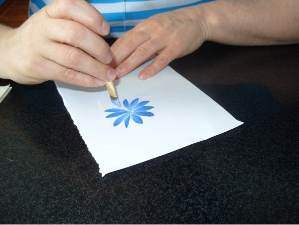 Прописываем все лепестки по кругу, осталось оформить серединку. Для этого окунаем кончик ручки кисти в желтую краску и ставим несколько точек в середине формируя круг.