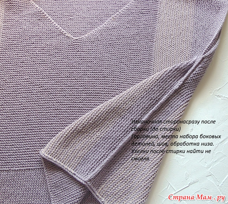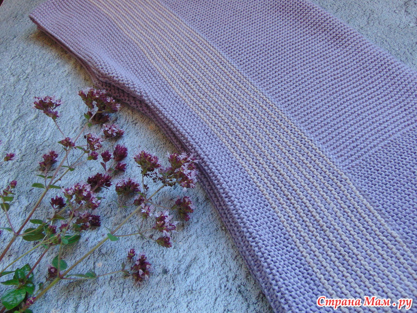 Если вяжем платочкой целое изделие, ОБЯЗАТЕЛЬНО делаем образец. (Для отделки по желанию. Но я вяжу.) Образец большой, петель на 40, можно больше. Постирать, дать высохнуть. Я через сутки образец измеряю и сухим вешаю на верёвку на сутки -двое. Потом смотрю процент растяжения. И только потом расчёты.