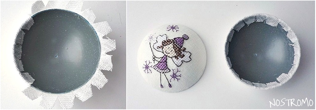 Затем наносим клей на шар и по диаметру разреза половинок, и приклеиваем оставшуюся ткань, особенно тщательно расправляя и растягивая на крае, без складок и заломов: