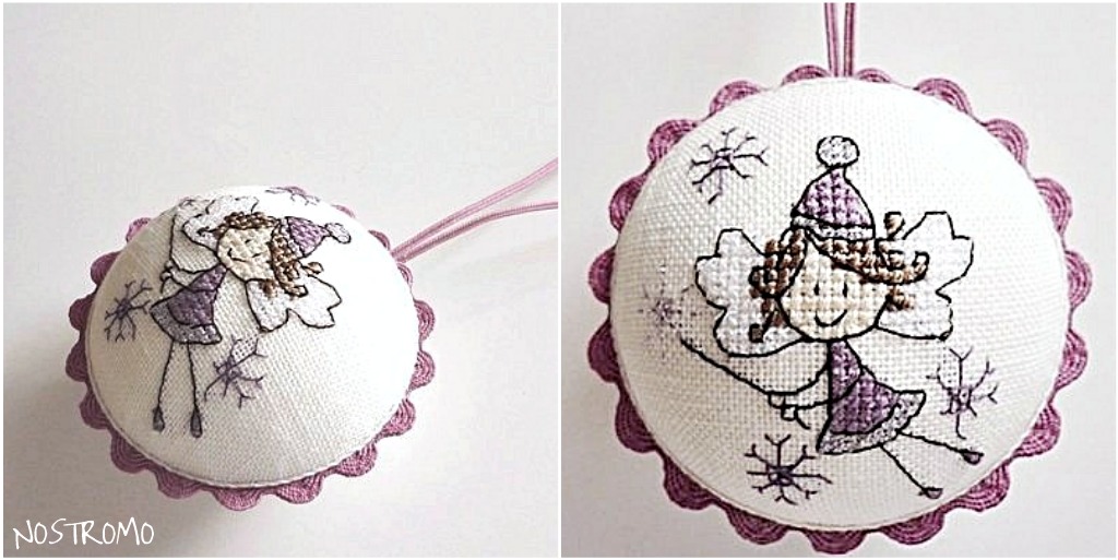 Макетным ножом разрезаем ёлочный шар по линии формовочного шва, на каждой половинке ищем центр и с помощью циркуля или измерителя рисуем окружность. Ножницами обрезаем ненужную часть шара, чтобы он был менее выпуклым, тогда легче будет натягивать на него ткань. Жидкостью для снятия лака снимаем краску до пластмассовой основы (если вдруг пластик окажется тёмного цвета, как у меня, а вышивка на светлой ткани, то нужно будет его покрасить белой краской,можно из баллончика), на наждачной бумаге делаем несколько круговых движений, чтобы край половинок был ровным.Из ткани с вышивкой вырезаем круги большего размера, чем нужно для оклейки половинок шара (лучше приложить ткань и померить "вживую"):